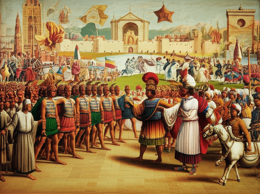 As conquistas militares e a formação de impérios também foram fatores importantes na interação cultural. A expansão do Império Romano, por exemplo, levou à difusão da cultura romana, do latim como língua administrativa e da organização social romana por vastas áreas da Europa e do Mediterrâneo. Esse processo de conquista e dominação, embora muitas vezes brutal, também levou à fusão de culturas, à criação de novas identidades e à difusão de conhecimentos. A cultura greco-romana, por exemplo, foi absorvida pelos povos conquistados, influenciando suas artes, literatura, filosofia e direito, e deixando um legado duradouro para a civilização ocidental.